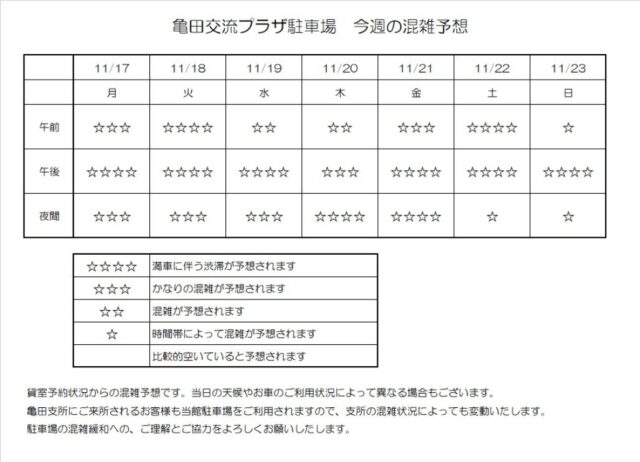 11月17日(月)から11月23日(日)までの駐車場混雑予想をご案内します。
