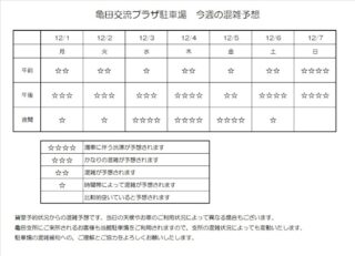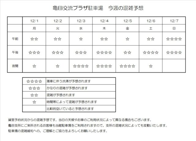 12月1日(月)から12月7日(日)までの駐車場混雑予想をご案内します。